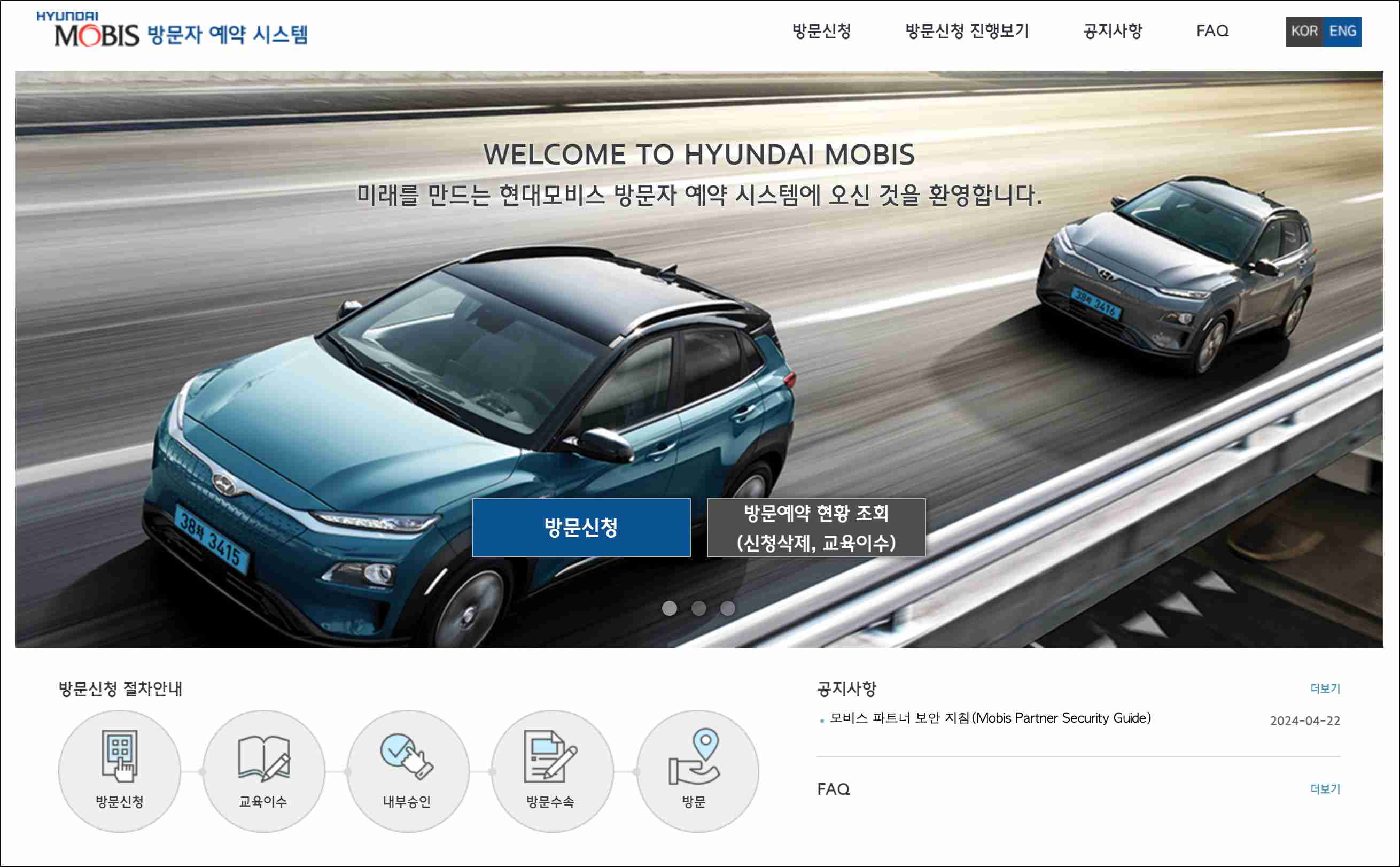현대모비스 방문자 예약 시스템은 외부 방문객이 사전에 온라인으로 방문 신청을 할 수 있도록 마련된 플랫폼입니다. 사이트 주소는 visit.mobis.com이며, 본사나 연구소, 공장, 물류센터 등 다양한 사업장에 대한 방문 예약을 이곳에서 진행할 수 있습니다