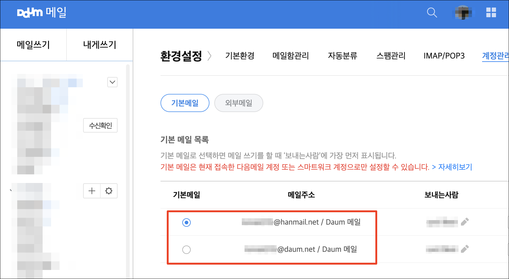 다음 메일에서 daum.net과 hanmail.net 어떻게 설정하는지?