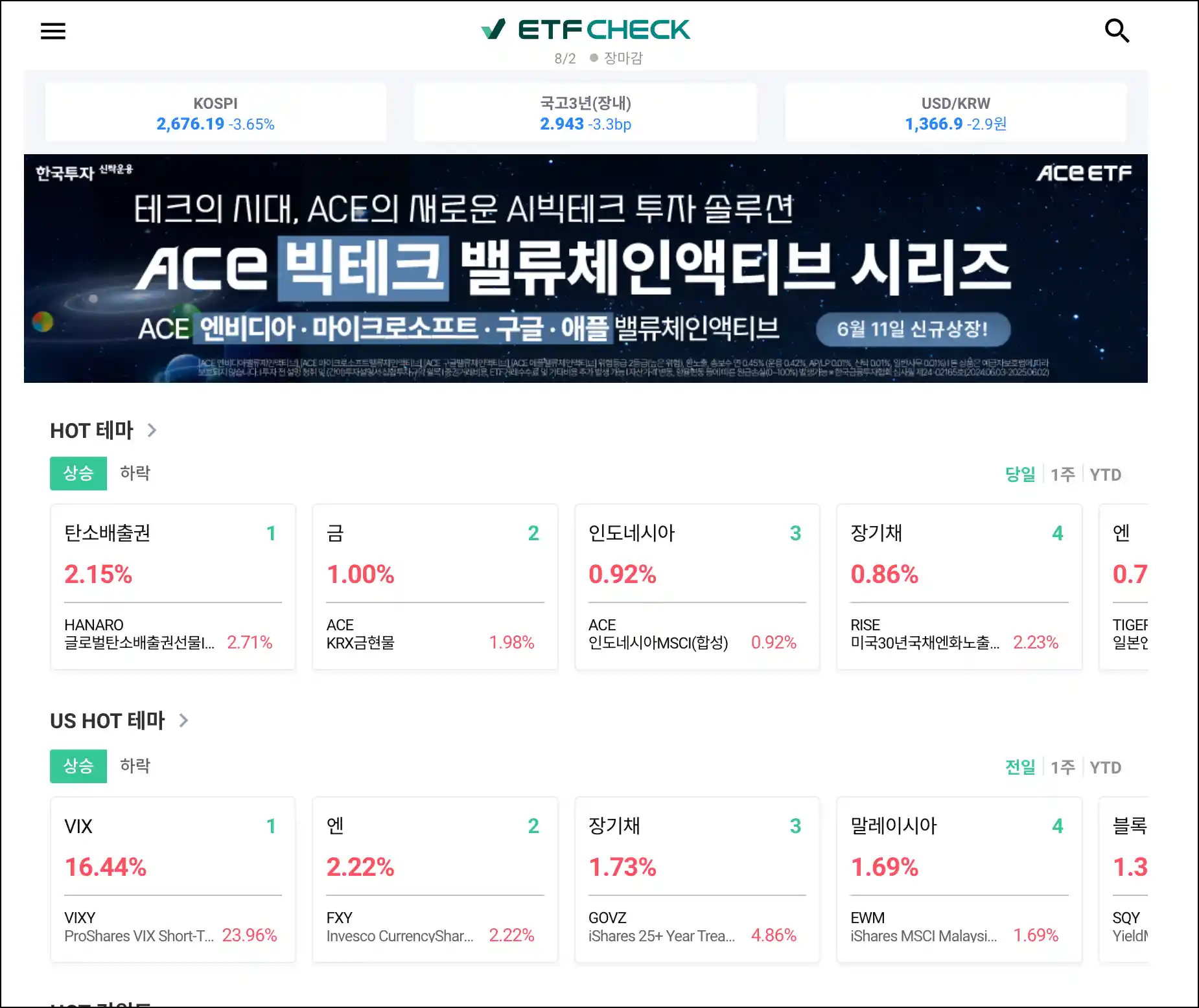 ETF CHECK는 ETF 관련 정보를 제공하는 사이트로, 다양한 ETF 상품의 시세, 성과, 분석 자료를 모바일 친화적으로 제공하고 있습니다. 주요 기능으로는 ETF 검색, 실시간 시세 확인, 투자 성과 분석, 시장 뉴스 등이 포함됩니다. 대상 사용자는 ETF 투자에 관심이 있는 개인 투자자 및 전문가들입니다. 사이트는 사용자가 ETF 관련 최신 정보를 신속하게 확인하고, 투자 결정을 돕는 것을 목적으로 합니다.