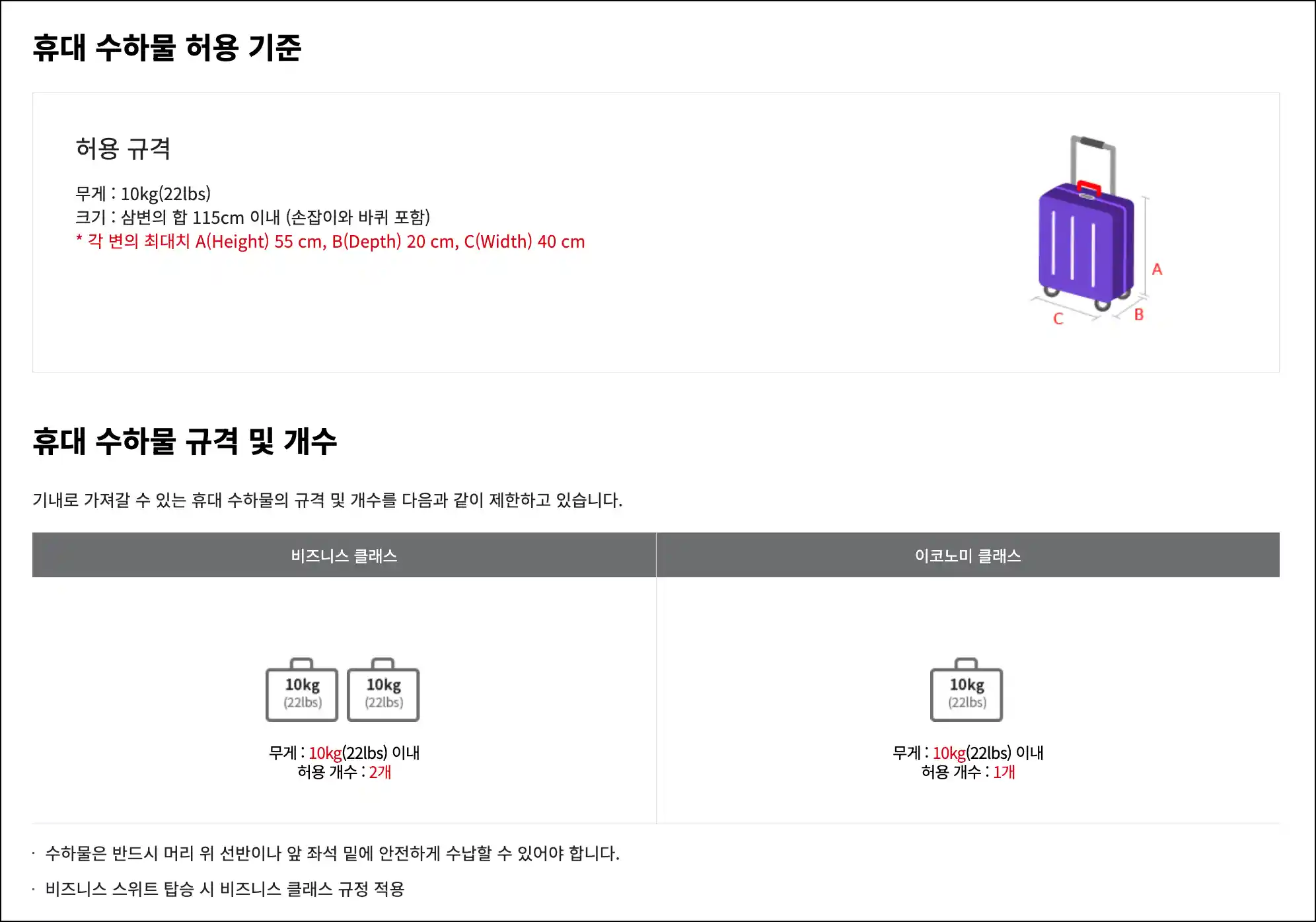 - 기내 반입 허용량: 일반석 승객은 최대 10kg의 수하물을 1개 반입할 수 있으며, 비즈니스석 승객은 최대 10kg의 수하물을 2개까지 반입할 수 있습니다.